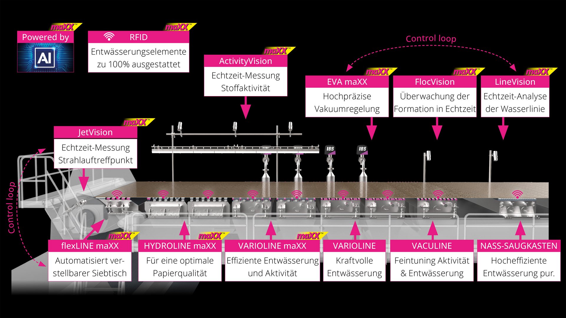 Der iTABLE® maXXTM ist die erste vollständig automatisierte Blattbildungszone für Fourdrinier-Maschinen. Das System bietet eine intelligente Steuerung und arbeitet mit künstlicher Intelligenz.